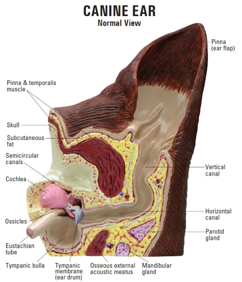 During this procedure, the entire ear canal is removed (total ear canal ablation) and the middle ear cavity is opened (bulla osteotomy) to remove all diseased tissues. The flap of the ear is called the pinna. The ear canal of the dog and cat is a cartilaginous tube, shaped like an “L”. The tympanic bulla is the boney cavity of the skull where the ear canal attaches.